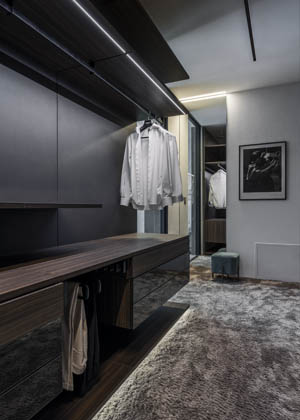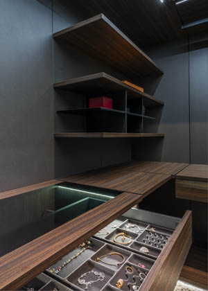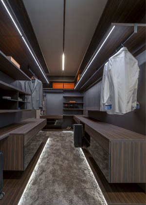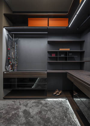 Foto: Sykora Koncepce celistvého náhledu na obytný prostor se nevyhnula ani šatnám. Šatna v dekoru Ořech Notte v kombinaci s Terra Brown a zádovým panelem Leather Terra rozvíjí filozofii otevřeného úložného prostoru, který je zároveň expozicí s individuálním vyjádřením osobnosti uživatele. Úložné moduly nabízejí široké množství využití, které má odpověď na všechny myslitelné potřeby uživatele. Osvětlení šatny je nevtíravé a lichotivé, spodní nasvícení skříněk působí noblesně a pocitově nábytek odlehčí. Použitými materiály, provedením i zvolenou barevností rozeznívá strunu luxusu a volně navazuje na zbytek bytu.