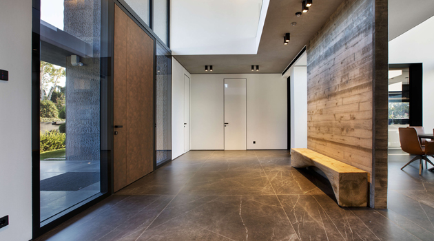 Jako hlavní vstup do domu slouží atypicky vysoké dveře, které se otevírají kováním vyrobeným v České republice. „Nejen pro vchodové dveře, ale pro veškeré dveře v interiéru, včetně těch vedoucích do sprchového koutu či saun, jsme použili kliky a madla z kolekce MINIMAL od českého výrobce M&T,“ informuje Aykut Mete a popisuje první setkání s produkty M&T: „Na tohoto výrobce klik nás navedli samotní majitelé stavby.