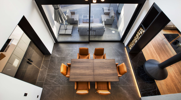 Domu s otevřenou fasádou byl architekty navržen interiér kombinující základní materiály, jako je ocel, beton a kámen. Tyto pocitově chladné luxusní materiály přitom působí na obyvatele přívětivěji a vřeleji díky hojnému použití dřeva a dřevodekoru přírodního dubu a také díky zemitým tónům barevné palety. „V projektech dáváme přednost používání přírodních a přirozeně vypadajících materiálů, jejichž vizuální podoba se díky mnoha alternativám, barevné a texturní rozmanitosti přizpůsobí jakémukoli designu,“ odůvodňuje výběr zvolených materiálů designér z ateliéru TEAM Project. Odlišnost a identita prostorů přitom byla zachována díky harmonickým materiálovým přechodům.