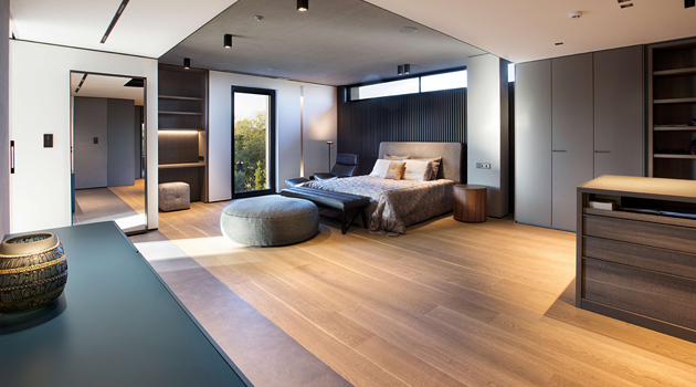 Schodištěm v pravé vstupní části domu se vystoupá do soukromého patra obyvatel domu. Hlavní koridor naproti schodišti prochází nad otevřenou jídelnou i prostorem předsíně a směřuje k dětskému pokoji a jedné z pracoven. Přímo nalevo od schodiště se pak nachází druhá z pracoven a také posilovna. Napravo od schodiště se vchází do prostorné ložnice majitelů, k níž náleží dvě oddělené šatny a soukromá koupelna s exkluzivními mramorovými obklady, závěsnými vodovodními bateriemi a přilehlou saunou.