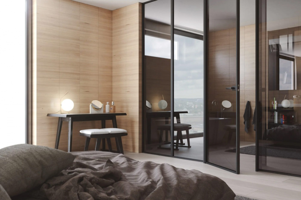 Dveřní rám z eloxovaného hliníku lze povrchově upravit dle vzorníků barev RAL K7, NCS, Creative Metallic a k výběru je i dostatek typů skel včetně neprůhledných, které dokážou vytvořit intimní prostředí a dveře tak lze smysluplně použít pro oddělení koupelny nebo šatny od ložnice.