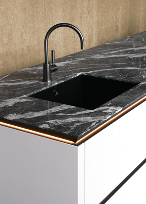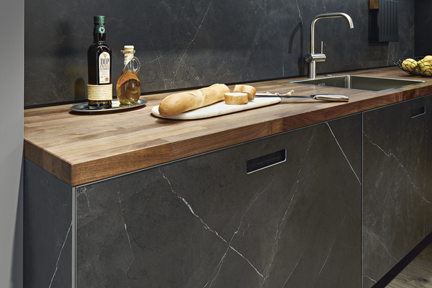 Jakkoli je tedy v současnosti už několik let hlavní trend nakloněný velmi tenkým deskám, jsou kuchyně, kterým masivnější deska doslova sluší. Dojem z desky výrazně ovlivňuje materiál a barevné provedení.
