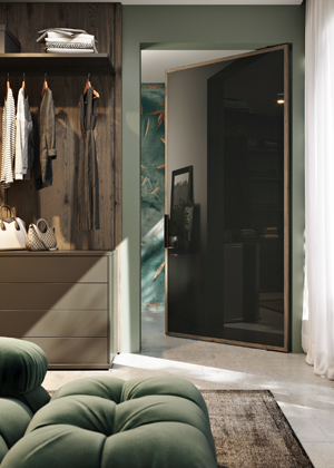 Pivotové dveře TWIST s otočným panelem a integrovaným skleněným panelem v dýhovaném rámu. Díky variabilitě skvěle poslouží i jako dělicí stěny nebo příčky → www.hanak-nabytek.cz