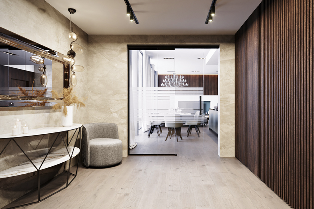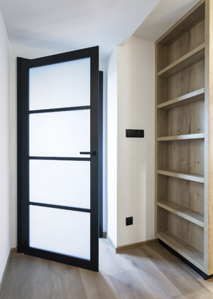 Minimalistický interiér si žádá čisté linie, funkčnost a nenápadnou eleganci — a to až do posledního detailu. Design dveří, které sahají do výšky stropu 370 cm, se tak stává nejen praktickým prvkem, ale i architektonickým gestem. Bezzárubňové, hladké plochy splývají se stěnou a podtrhují velkorysost prostoru, zatímco skryté panty a decentní úchyty dávají vyniknout samotné výšce a jednoduchosti.