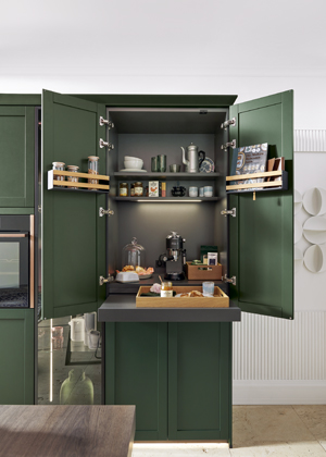 Foto: SchüllerMultifunkční skříň ze sestavy Newport (Schüller) disponuje chytře uspořádaným prostorem k vytvoření dokonalého zázemí pro přípravu snídaní → www.schueller.de