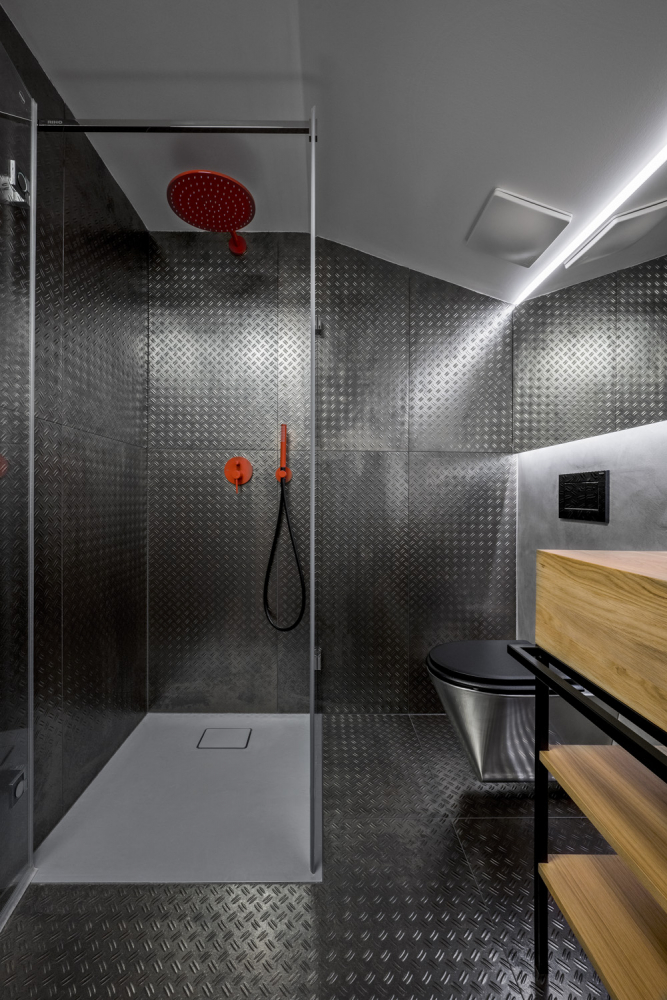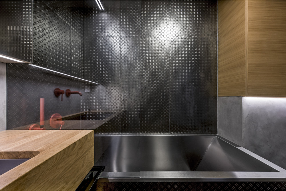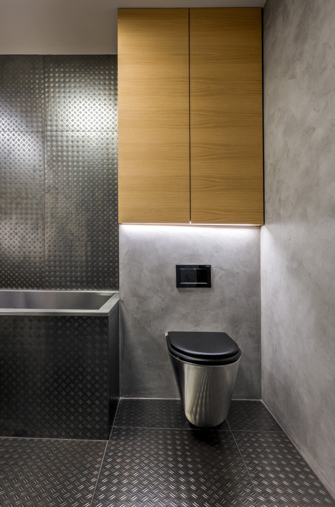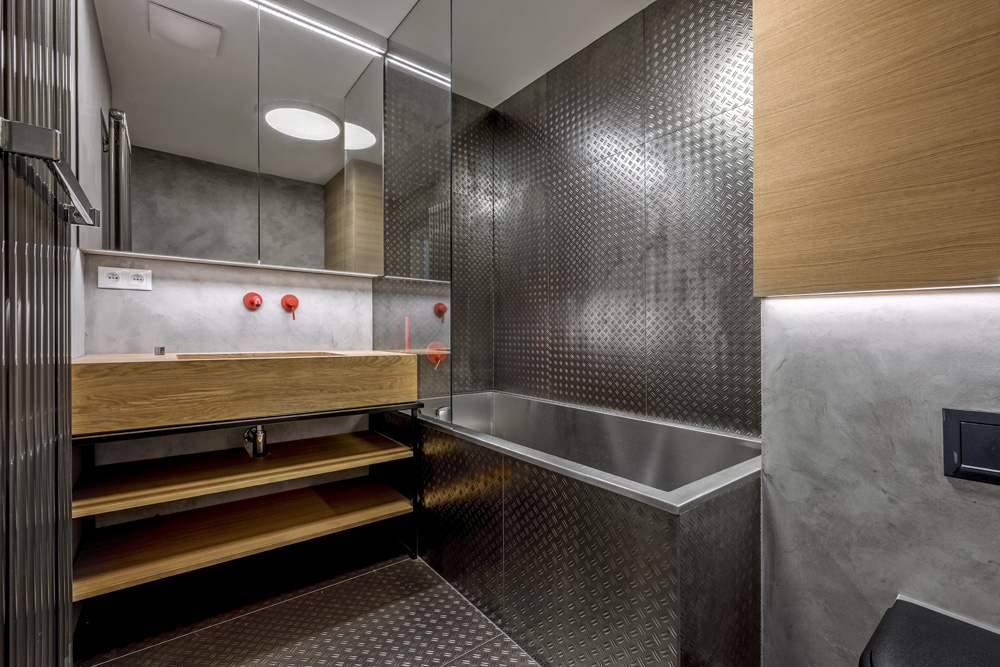 Nábytek je dubový s černě lakovanou kovovou kostrou a vizuálně stmeluje koupelnu se zbytkem bytu. Ani sanita není tradiční keramická, ale toaleta, vana i umyvadlo jsou nerezové. Barevně zcela vybočují umyvadlová, vanová a sprchová baterie v hlasitém červeném tónu, který dodá dynamiku, ale také podvědomě odkazuje na pro továrny tak typické výstražné tabulky. Vidět tuto koupelnu Dexter, byl by nadšený!