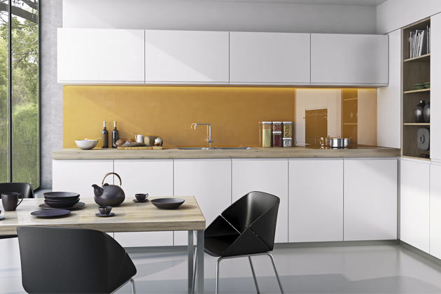 T.lack (Trachea) je jeden z nejvariabilnějších povrchů pro kuchyňské plochy. Nabízí nepřeberné množství barevných odstínů v lesku i v matu, umožňuje patinování i frézování. Kromě dvířek jej lze krásně aplikovat i na nástěnné panely a vytvořit v minimalistické bílé kuchyni hravý kontrast → www.trachea.cz