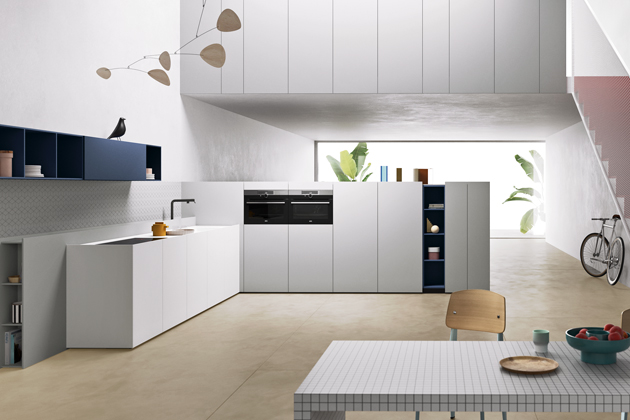 Slim (Meson’s), minimalistická kuchyň pojatá jako variabilně využitelná polopříčka dělící zóny prostoru a nabízející pro každou úložnou kapacitu, materiál super matný Fenix → www.puntodesign.cz