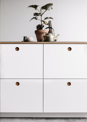 O vyznění kuchyně může opravdu rozhodnout jeden maličký detail. V případě řady Basis (Reform) kulatý tvar vyfrézovaných úchytek s dýhovaným podkladem, který evokuje nábytkářskou estetiku 60. let. Za zmínku stojí i použití linolea, s nímž se budeme setkávat u kuchyňských dvířek čím dál více → www.reformcph.com