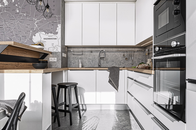 Bílá nemusí být nudná. V kombinaci s výraznou kresbou pracovní desky v provedení dub Halifax, s obkladem Chicago se vzhledem betonu a výraznou tapetou získala kuchyň navržená Ing. arch. Tiborem Csukásem (JN Interier) příjemný industriální nádech podtržený černými spotřebiči a doplňky → www.jninterier.cz