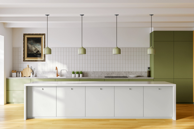 Dva bloky a dvě barvy použité jako v sestavě Dolti Collection (Oresi) dokážou v kuchyni divy. Prohloubit dojem prostoru a vytvořit zábavnou kompozici. V tomto případě tvořenou šedým matným a tlumeným zeleným odstínem, jejichž souhru můžete s úspěchem aplikovat na další prvky a doplňky kuchyně → www.oresi.cz