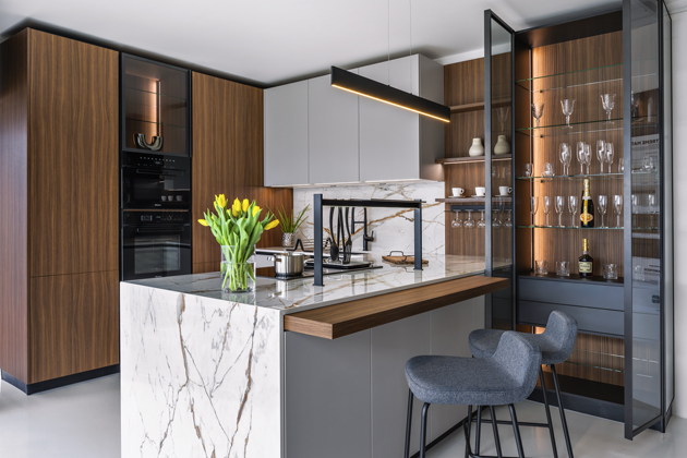 Základem kuchyně (Sykora) je kombinace laku Evermatt v kašmírovém odstínu, luxusního lamina v dekoru ořechu mocca a kouřového skla, výrazným prvkem je barový pult integrovaný do ostrůvku a přiléhající prosklený bar → www.sykora.eu