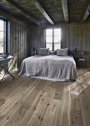 Dřevěná krytina Kährs Smaland v dekoru Dub Ydre s přírodním olejem mořená do šeda. Kartáčovaná,