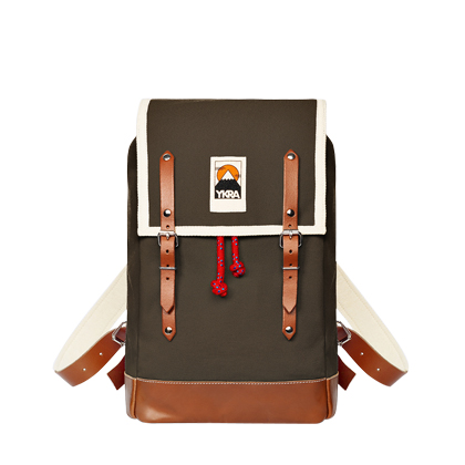 Batoh Matra (Ykra) je inspirovaný starými turistickými tornami, provedení bavlněné plátno a kožené detaily, objem 20 l, 43 × 26 × 14 cm, cena 6 725 Kč
