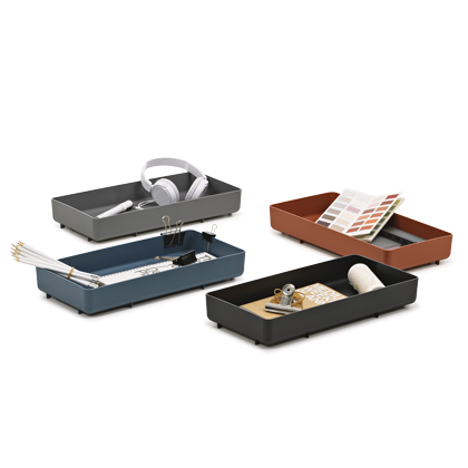 Stolní organizéry na drobnosti Chap Tray (Vitra), design Konstantin Grcic, jsou vyrobené z recyklovaného plastu, rozměr 6,5 × 20 × 41,5 cm, cena 769 Kč