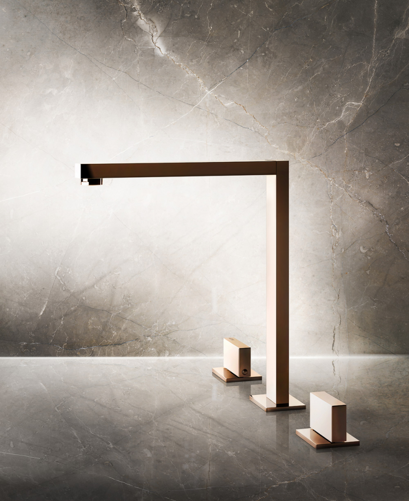 Kolekce stojánkových umyvadlových baterií Rettangolo (Gessi) otevřela po svém uvedení na trh v roce 2002 cestu k základní eleganci čtyřhranných a minimalistických forem, které se nikdo předtím neodvážil použít.