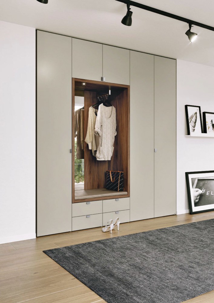 Konkrétně pro mě je zajímavým řešením systém S35 od výrobce Schmalenbach. Jedná se o walk-in šatník, který je komponovatelný z nástěnných panelů, na které se dají snadno připevnit police, věšáky nebo šuplíky. Nástěnné panely tvoří opěrný systém, a proto není třeba přidávat boční stěny jako u klasických skříní. Díky tomu je celkový prostor vzdušnější a přehlednější. Toto řešení je ideální do uzavřených šaten nebo vstupních hal. Velmi pěkně se s tímto systémem pracuje i po designové stránce.