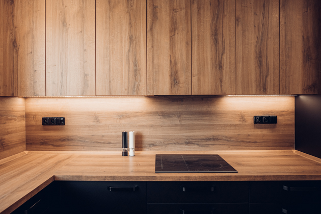 Při rekonstrukci kuchyně majitelé zvolili odvážnou kombinaci černé a dřevodekoru. Díky použití důmyslného materiálu s příměsí pravého stříbra získali nejen designově vytříbenou, ale také hygienickou, téměř bezúdržbovou a dokonale matnou kuchyň v moderním tmavém hávu.