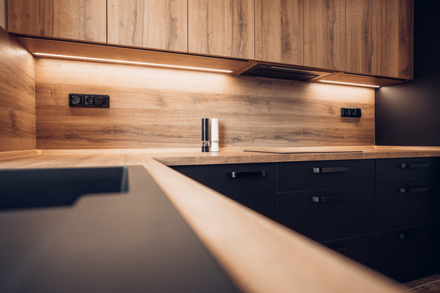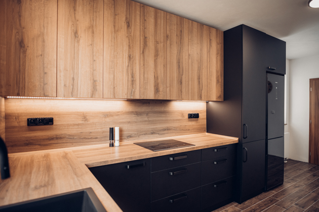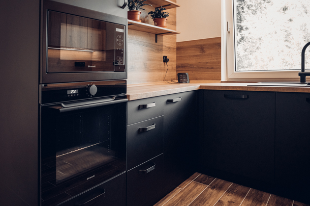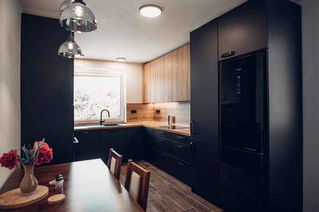 Především černá barva je skutečně stěžejním elementem místnosti. Vyskytuje se jak na kuchyňské sestavě a elektrospotřebičích, tak na dalším vybavení, jako je dřez či vodovodní baterie značky Franke. Výrazný odstín je proto odlehčen pracovní deskou v dekoru dub Sherman koňakově hnědý a nástěnným obkladem ve stejném provedení. Jejich jemná povrchová struktura v imitaci dřeva úspěšně doplňuje a zároveň rozbíjí jednolitý efekt kuchyňských skříněk, v kombinaci s vhodně umístěným oknem navíc zabraňuje vzniku tísnivé atmosféry. Vybavení potom doplňuje podlaha, která je stejně jako jídelní stůl laděna v odstínu tmavého dřeva. Díky tomu dobře koresponduje s nadčasovým zbarvením dvířek i vrchním dřevodekorem a dodává tak místu kýžený dojem ucelenosti.