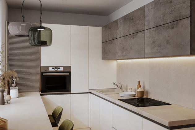 Kuchyňkou linku sestavte ze skříněk, které budou vizuálně vytvářet kompaktní celek. Nebojte se využít prostor na maximum, horní kuchyňské skříňky zvolte co nejvyšší. Skříňky do stropu využijí prostor, který jinak zůstává ladem, a poskytnou další praktický úložný prostor. Pokud se rozhodnete pro rohovou kuchyň, na kratší stěnu můžete umístit vysokou kuchyňskou skříň s otvorem pro troubu a mikrovlnku (tzv. komínové uspořádání spotřebičů) a pohodlně objemnou potravinovou skříň pro uložení zásob. Aby vznikl dostatek pracovní plochy, je šikovné zvolit rozdělené horní a spodní skříňky. Nevíte kam s kuchyňským robotem nebo toustovačem, aby nezabíraly místo na pracovní ploše a zároveň byly po ruce? Přesně pro takové účely je kuchyňská skříňka s roletovým zavíráním. Ukryje vše, co by jinak zabíralo místo na kuchyňské pracovní desce. Jednoduše zatáhnete roletku dolů a je to.