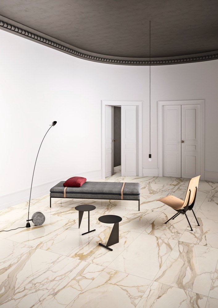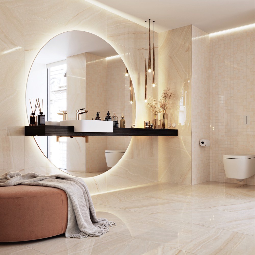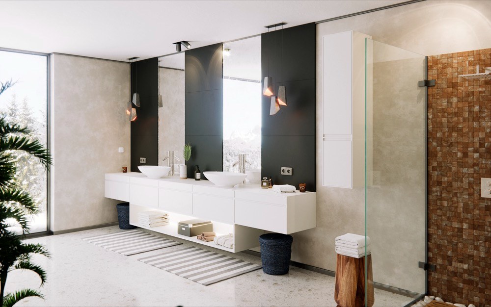 Koupelna s minimem spár působí uceleně, kompaktně. Navíc když si představíte dlažbu ve formátu 120 x 260 cm, tak třeba struktura mramoru krásně vynikne a přiměje vás i pochybovat o tom, jestli se skutečně nejedná o opravdový mramor. Snažte se ale prostor zbytečně nepřeplnit koupelnovým nábytkem příliš velkých rozměrů, aby si stále zachoval vzdušnost. Jen tak může tento materiál vyniknout!