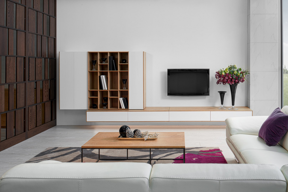 Pokud plánujete v obývacím pokoji ukládat či vystavovat větší množství věcí, neváhejte sáhnout po úložném nábytku orientovaném na výšku. Otevřený policový systém může sahat klidně až ke stropu.