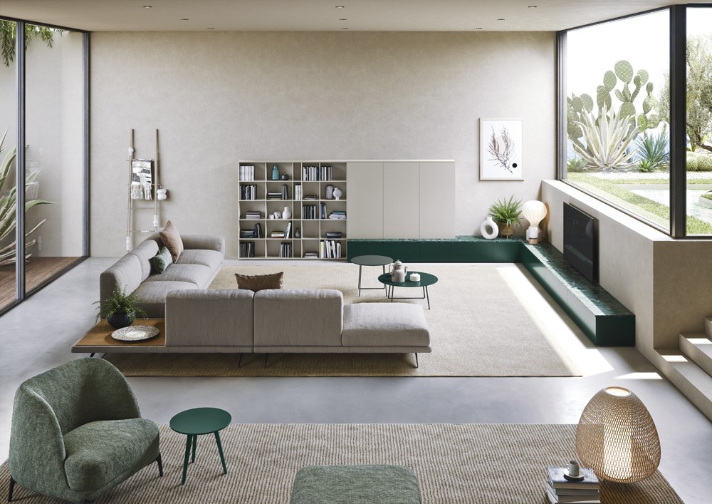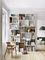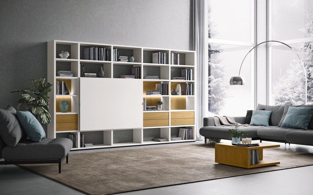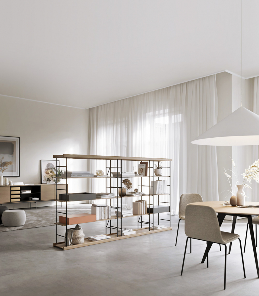 Pokud plánujete v obývacím pokoji ukládat či vystavovat větší množství věcí, neváhejte sáhnout po úložném nábytku orientovaném na výšku. Otevřený policový systém může sahat klidně až ke stropu.