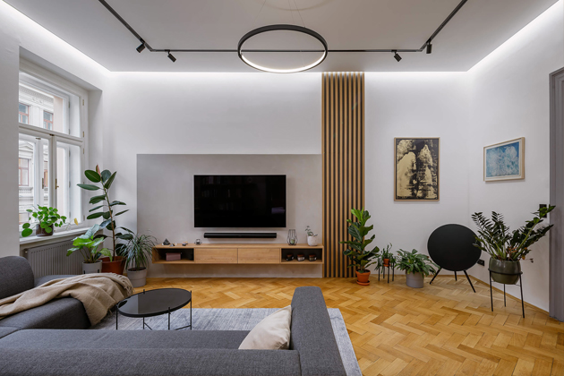 Nové prostorové řešení vstupní části bytu splnilo zadání majitelů a byly vybudovány hned dvě plnohodnotné koupelny s novým podlahovým vytápěním. Kuchyň s jídelnou si žádala nové parkety a prostorná kuchyňská linka byla provedena v tmavě šedé barvě v kombinaci se dřevem. Ložnice je záměrně navržena v co možná nejčistším a nejjednodušším designu pro klidný odpočinek majitelů. Přibyla v ní samostatná šatna a na míru zhotovená postel v dekoru dřeva. Obývací pokoj je tvořen kombinací barev a materiálů, které prostupují celým bytem. V návrhu bylo pamatováno i na pokojové rostliny, kde každá získala svůj vlastní prostor, což je patrné například u dominantní knihovny.