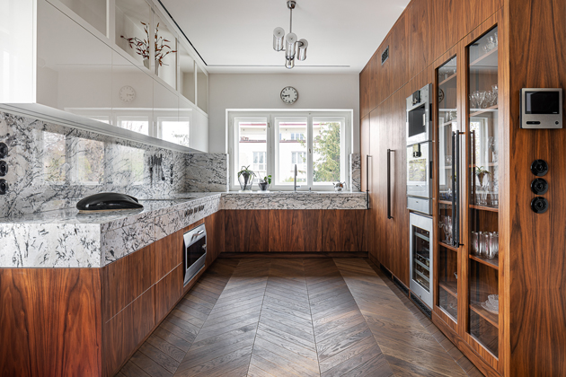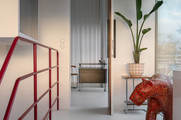 Designérka při návrhu navazovala částečně na původní plány vily a následně na dokumentaci od StudioPAB, které jí poskytlo v tvorbě interiéru autorskou svobodu. „K návrhu interiéru jsem přistupovala s velkým respektem k funkcionalismu. Od začátku jsem měla o prostoru a zařizovacích prvcích konkrétní představu. Důraz jsem kladla zejména na detail a atypickou autorskou výrobu,“ popisuje. Nebála se použití sytých barev ani výrazných struktur kamene, kterých je ve vile celkem osm druhů. Celým domem pak prochází motiv ohybu funkcionalistické trubky, pro dospělé v chromované úpravě, pro děti v různých barevných odstínech.