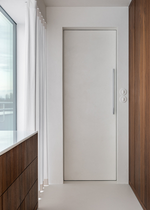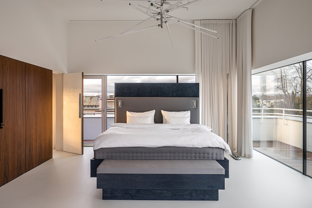 Jejich přítomnost prozrazují pouze subtilní madla YES! v černém provedení. „Tato madla jsem volila záměrně, jelikož jejich elegantní linie navazuje na netypickou stropní umyvadlovou baterii, kterou jsem použila do koupelny náležící k ložnici,“ říká designérka Jana Trunda, která v nejvyšším podlaží využila kování Magnetic s madly YES! od českého výrobce M&T. „Systém Magnetic funguje ryze na principu magnetů zabudovaných do dveřního křídla a jejich protikusem ve dveřní zárubni. Když se k sobě obě části přiblíží, dveře plynule dovře a v zárubni pevně drží pouze magnetická síla, bez vysunutí jakékoliv střelky. Proto není k otevření dveří potřeba klika, ale stačí úchopové madlo,“ popisuje princip fungování systému Magnetic Roman Ulich, hlavní designér společnosti M&T. Autorka interiéru zvolila madla ve verzi s integrovaným WC/koupelnovým uzamykáním.