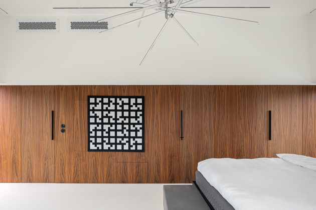 Do nejvyššího podlaží, které náleží manželskému páru, vede cesta přes malé mezipatro. Do tohoto prostoru nechal majitel umístit červenou sochu šelmy ze své soukromé sbírky. Z prostorné ložnice se díky velkým proskleným plochám otevírá pohled do širokého okolí. Výrazný prvek zde tvoří ořechový obklad stěny, ve kterém jsou zakomponované dveře od společnosti Dorsis ve stejném dekoru.
