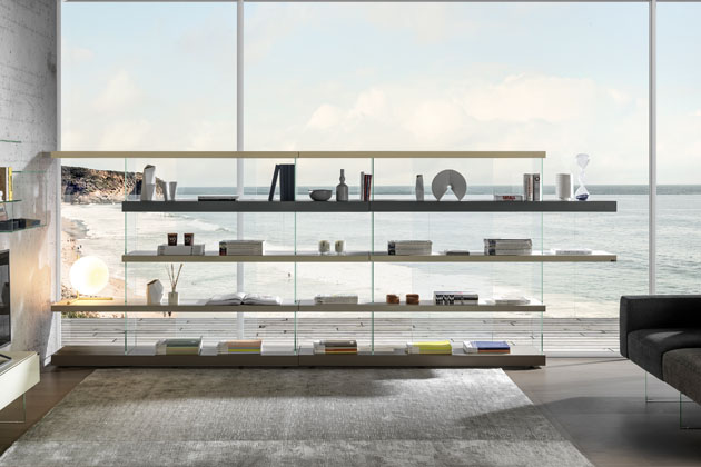 Foto: LagoAir (Lago), design Daniele Lago, knihovna upoutává éterickou vertikální konstrukcí z čirého kaleného skla odlehčující masivní police či úložné moduly, cena dle konfigurace → www.lago.cz