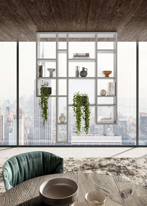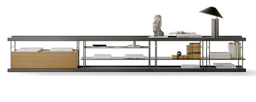 Pacifico (Opinion Ciatti), design Lapo Ciatti, minimalistická knihovna s ocelovou konstrukcí a hloubkou pouhých 24 cm je jako stvořená i do úsporných prostor, cena na dotaz→ www.opinionciatti.com