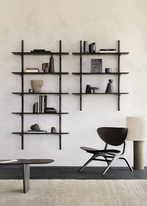 Foto: EthnicraftPI Wall Shelf (Ethnicraft), nástěnný policový systém, masivní mahagonové dřevo v přírodní či tmavě hnědé barvě, varianta se třemi a pěti policemi, cena od 18 174 Kč → www.stockist.cz