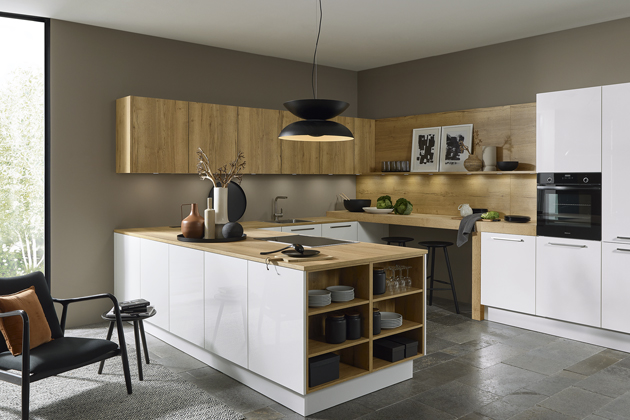 Kuchyň Nolte, pracovní deska a část obložení stěny laminát s dřevodekorem dubu Ventura → www.nolte.de