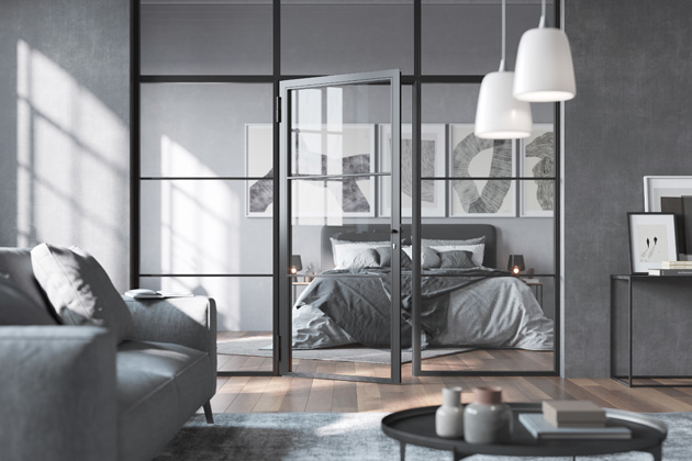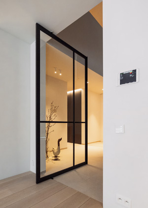 Otočné dveře Idea se zárubní Garde (JAP), minimalistické až technicistní spojení subtilního rámu z eloxovaného hliníku a kaleného skla, cena na dotaz → www.jap.cz