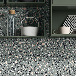 Foto: 41Zero42Futura (41Zero42), dlažba s betonovým vzhledem a pastelovým dekorem, formát 15 × 15 cm, cena 3 750 Kč/m² → www.perfecto.cz
