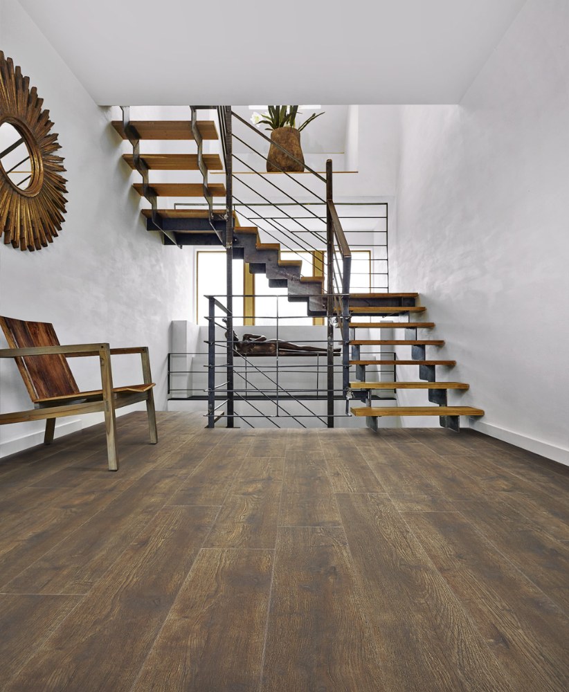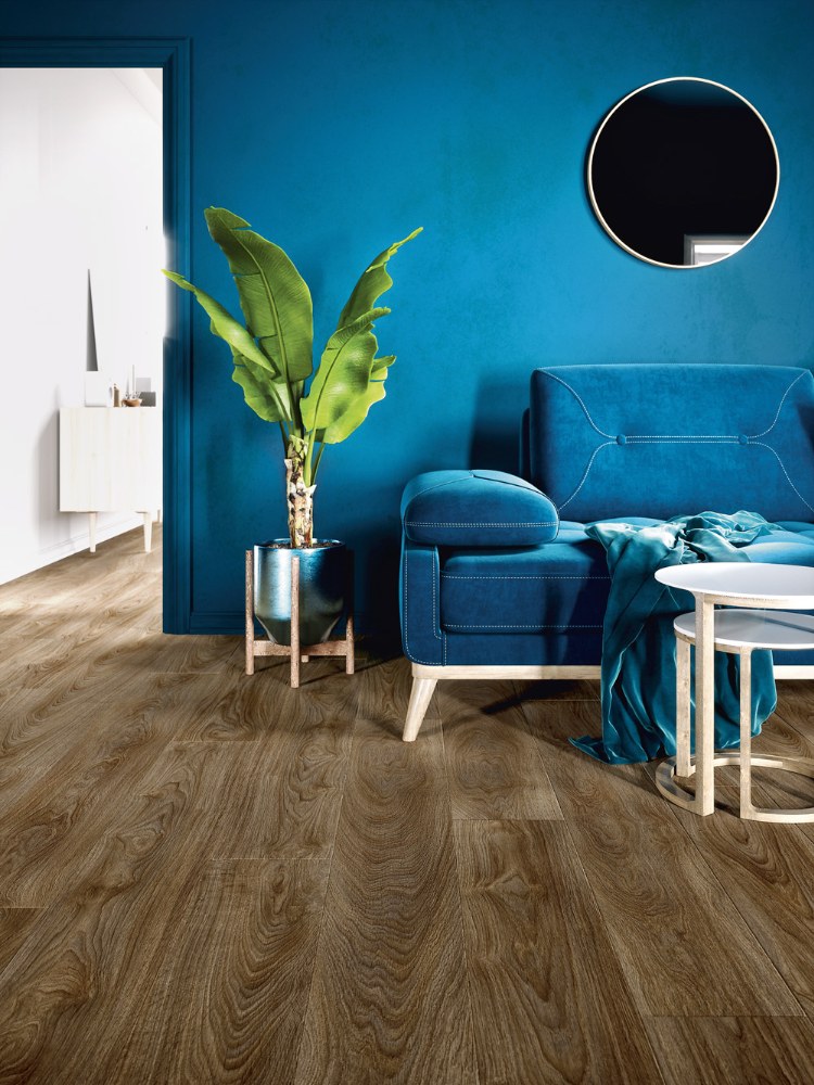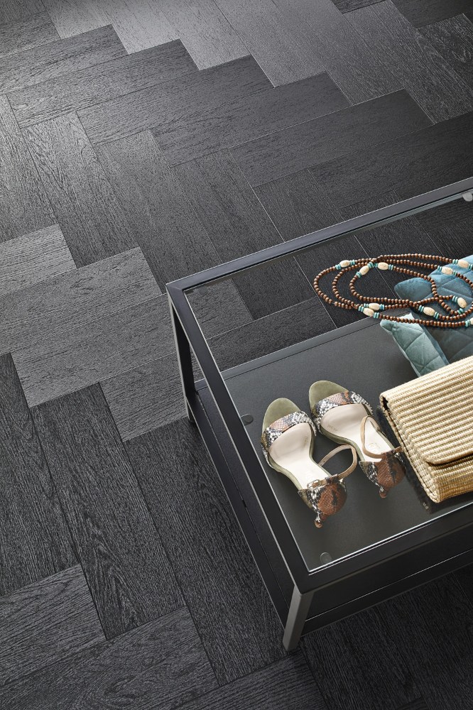 Na podlahové krytině se vzhledem tmavého dřeva dobře vynikne struktura a kresba dekoru, jehož plasticita překvapí i v případě kvalitních vinylů nebo laminátů. Dobře jí to ladí například se sametem, masivním dřevem, mosazí a doplňky v lehce orientálním stylu.