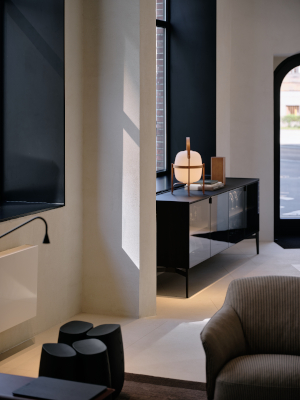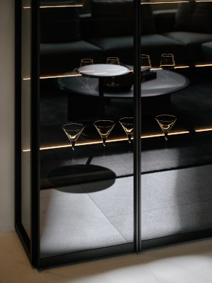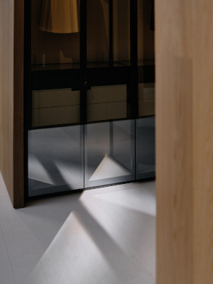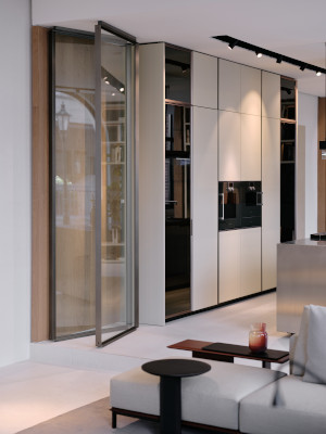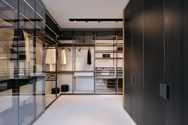 Ve vstupním prostoru, který je v neobvyklém pětiúhelníkovém půdorysu, vás uvítá stůl Concorde v kulaté verzi, symbolický projev přijetí a pospolitosti. Odsud se interiér symetricky rozbíhá do dvou částí, kde se nachází nábytek, doplňky a nábytkové systémy uspořádané v téměř muzejním pojetí. Můžete tak prozkoumávat a objevovat ucelenou kolekci Poliform, od obývacího pokoje, šatny, ložnici přes jídelnu až po kuchyň, abyste dospěli k ideální představě o harmonickém domově.