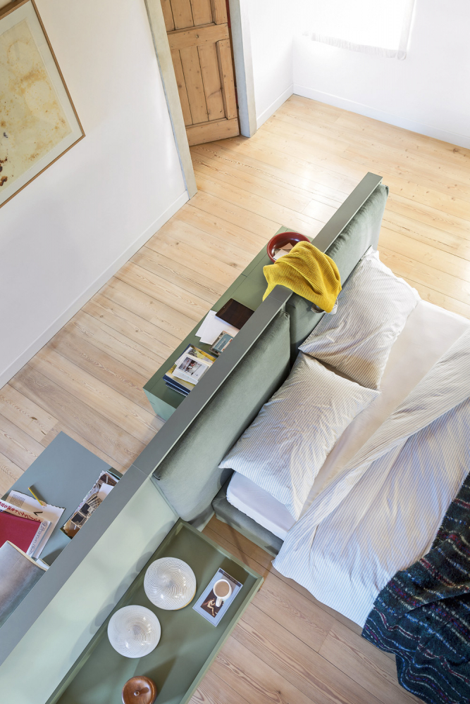 Optimální je ponechat prostor co nejvíce otevřený. Je-li nutné jednotlivé funkční zóny oddělit, pak nejlépe posuvnými příčkami z transparentních materiálů nebo multifunkčními nábytkovými systémy. Kompaktněji působí nenásilné přechody a přímé navázání jednotlivých funkčních zón. Šatní skříně navazující na kuchyňskou linku vůbec nemusejí vypadat nepatřičně – stačí sjednotit materiály a barevnost. V případě vysokých stropů je vhodné vestavět lůžko přímo nad pohovku a prostor pod nášlapy využít na ukládání, popř. zvolit prostorově úsporný a výrazově subtilní žebřík z kovu nebo dřeva vyrobený na míru.