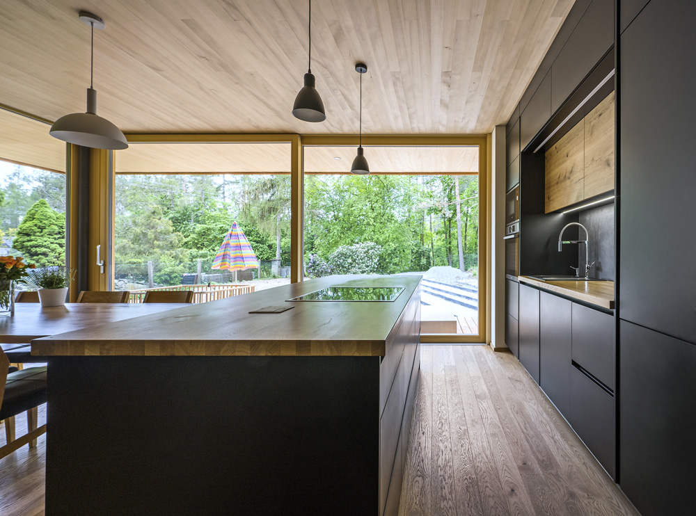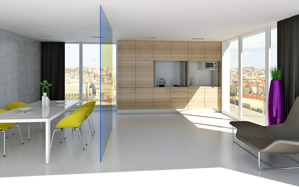 Propojení kuchyňské, jídelní a obývací zóny je charakteristickým znakem dispozičně skromného bydlení, právě v takovém případě se vyloženě nabízí sjednotit materiál a dekor kuchyňského nábytku s ostatními místnostmi.