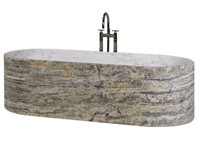 Foto: KreooVolně stojící vana Blessed (Kreoo), design Christope Pillet, mramor Bianco Carrara a Bianco del Re pro vnitřek vany, vnější plášť více mramorů, travertin i polodrahokamy, cena na dotaz → www.kreoo.com