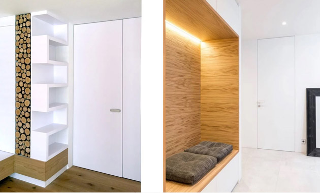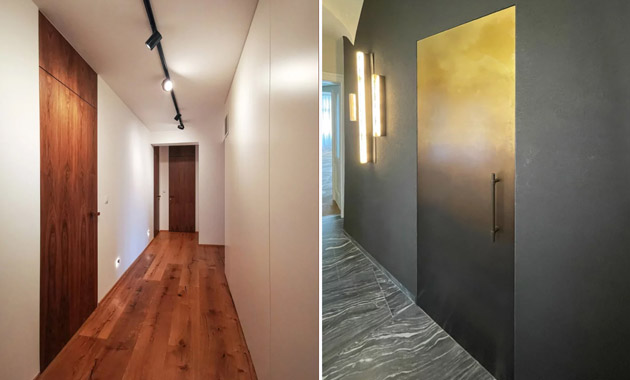 Druhým atraktivním trendem je používání dřevěné dýhy, která je shodná s dýhou na okolním nábytku, soulad v interiéru je pak opravdu dokonalý. Často proto instalujeme dveřní křídla s přírodním nebo sukatým dubem v matném laku nebo oleji.