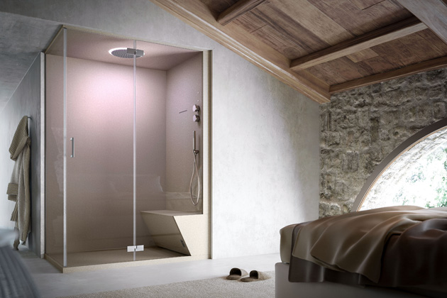 Non Solo Doccia Home (Glass 1989) , multifunkční sprchová kabina s párou, aromaterapií a chromoterapií, vše snadno ovladatelné na nástěnném panelu s termostatickou baterií, cena na dotaz → www.ronalbathrooms.com
