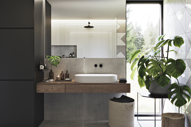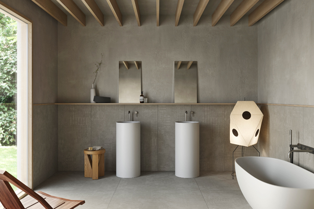 Obkladům imitujícím přírodní povrchy sluší velké formáty a minimální spára, která nechá vyniknout odchylky a nepravidelnosti ve struktuře i kresbě. Prostor tak získává punc autenticity.