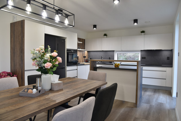 …může se čarovat ve velkém. A pokud je k tomu kuchyně plánována ještě před výstavbou domu, pak je to čirá radost! Majitelky si totiž už v rámci výstavby dřevostavby naplánovaly místnost pro kuchyň o takových rozměrech, aby se do ní vešel dostatek pracovního, ale i úložného prostoru a k tomu i velký jídelní stůl pro velkou rodinu. „Požadavky klientek už v rámci plánování byly poměrně jasné – tvar kuchyně do L, dostatek pracovní plochy, dobře využitelné úložné prostory a jemné barevné kombinace. Původní noty jsem si následně utřídil a vytvořil několik návrhů, které jsme spolu prodiskutovali. Finální kuchyňský prostor jsem navrhnul tak, aby jako celek vytvořil funkční a současně designové místo,“ popisuje počátky plánování kuchyně designér Robert Kývala a dále pokračuje: „V rámci plánování jsme provedli také několik stavebních úprav spočívajících především ve změnách otvorů oken tak, aby měl prostor maximum přirozeného denního světla.“ To v kuchyni zajišťuje nejen podlouhlé okno zasazené mezi pracovní desku a horní skříňky, ale i dvě francouzská okna – jedno v úrovni ostrůvku a druhé za jídelním stolem.