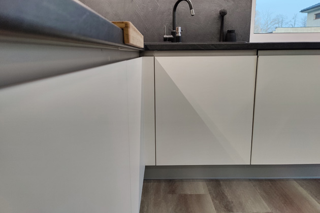 Aby bělavé tóny dvířek nic nenarušovalo, zvolil designér důmyslné řešení úchytek. „Horní skříňky jsou opatřeny úchytkami zafrézovanými z vnitřní strany. To zaručí, že jsou na první pohled prakticky neviditelné a přitom se díky nim dvířka snadno otvírají a zavírají. Plynulý přechod mezi tmavší pracovní deskou a světlými čely skříněk pak zajišťují hliníkové úchytky. Dohromady tak tvoří jemnou a elegantní dvojici,“ popisuje Robert Kývala.