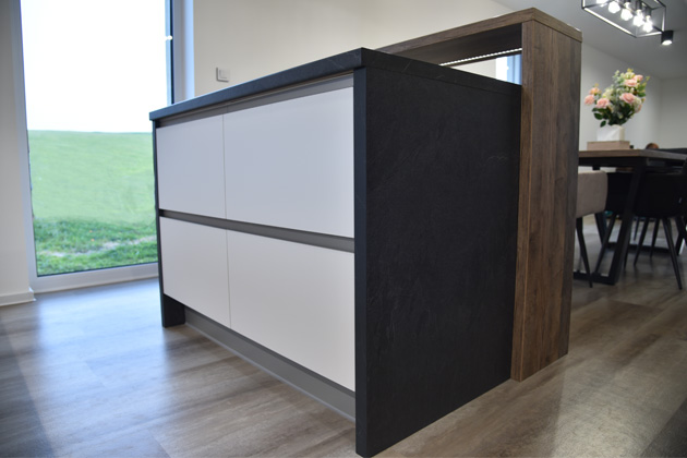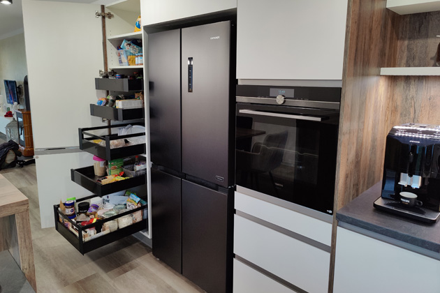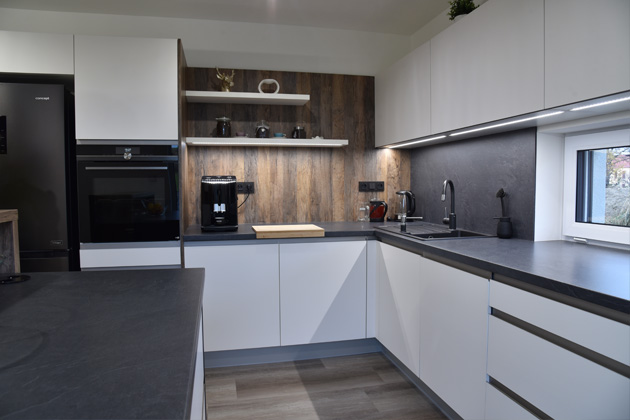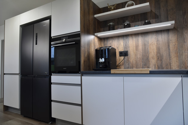 Materiálově byla kuchyň vybavena tak, aby bez problémů obstála i při maximálním vytížení. „Pracovní desku a zadní rohovou stěnu v dřevěném dekoru tvoří LTD desky, nicméně převládajícím materiálem čel skříněk a zásuvek je nanolaminát FENIX. A to hlavně z důvodu jeho odolnosti a praktičnosti. Díky dlouholetým zkušenostem, které s FENIXem mám, jej ve svých realizacích používám často,“ vysvětluje Robert Kývala. V čem tkví jedinečnost tohoto povrchu, doplňuje Martin Dusík, zástupce společnosti Trachea Wood, tradičního českého výrobce nábytkových dvířek: „Mechanickou odolnost HPL nanolaminátu FENIX vůči poškrábání, nárazům i působení tepla zajišťuje vrstva odolných pryskyřic zpracovaných za pomoci nanotechnologií. Navíc na něm nezůstávají otisky prstů, což je zvláště v kuchyni víc než žádoucí.“