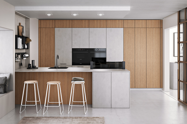 Ferra/Groove (Livanza), ostrůvková sestava z laminátu v dekoru uhlazeného písku a v dekoru Dark Groove, s jemnou strukturou dřeva s hlubokou rýhovanou strukturou, doplnit ji může pracovní deska z keramiky Dekton → www.oresi.cz