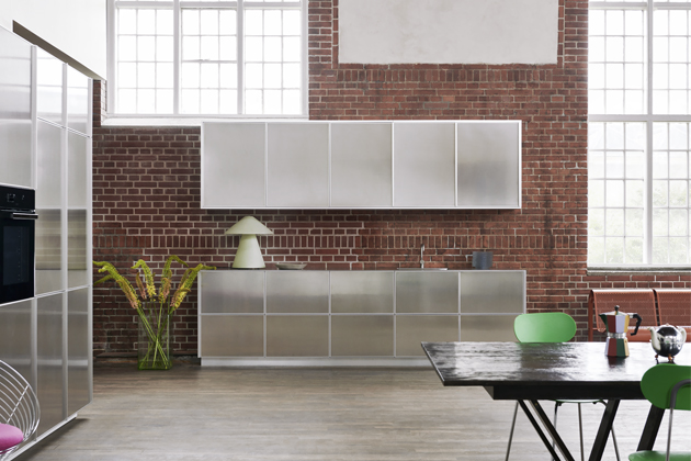 Reflect (Reform), design Jean Nouvel, minimalistická kuchyň s kovovým vroubkovaným pláštěm a deskou z nerezavějící oceli přinese s dopadajícím světlem do interiéru vždy jinou atmosféru → www.reformcph.com